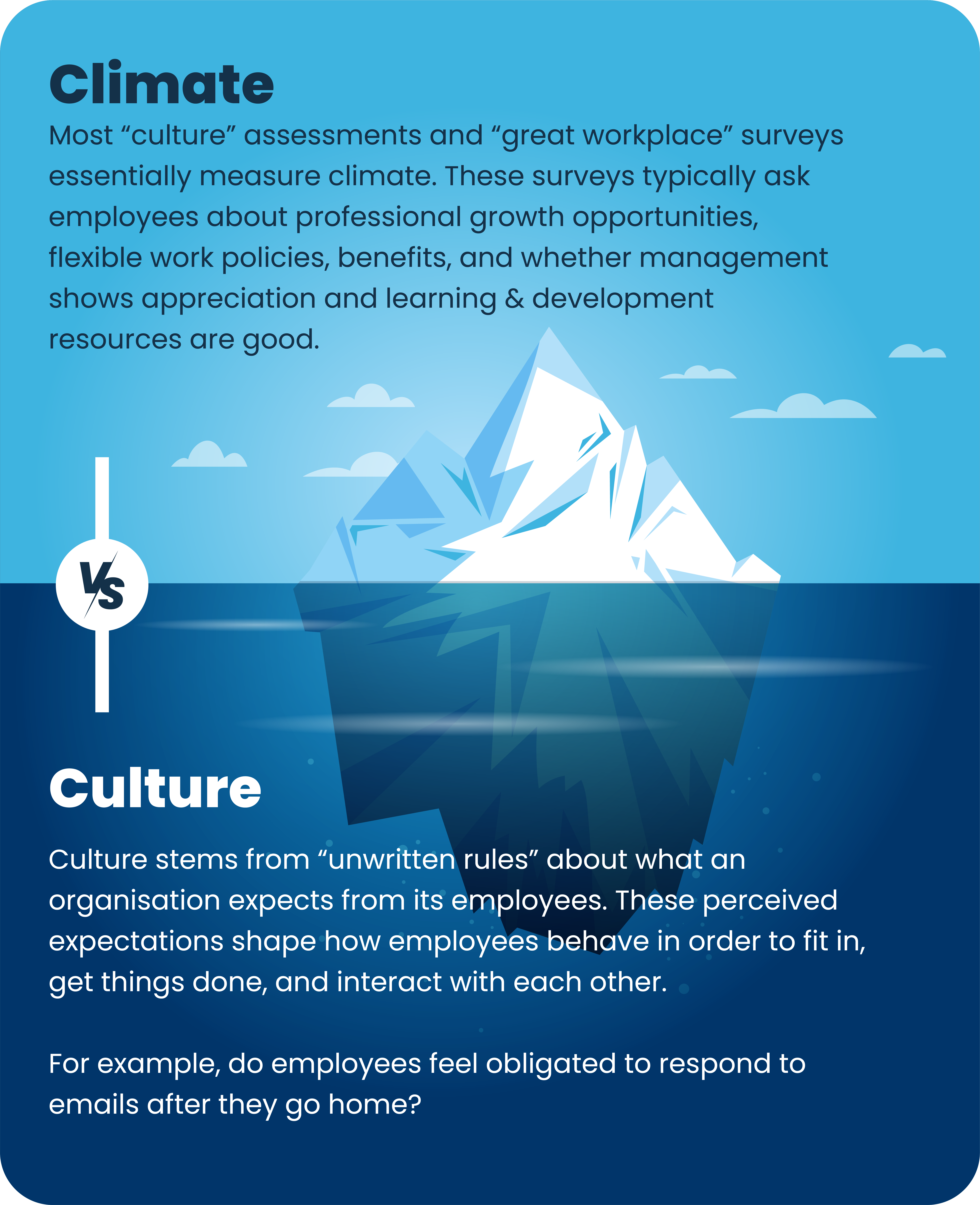Many organisations fail in their culture change efforts because they inadvertently focus on changing organisational climate, which is only an aspect of culture. Changes in climate can bring some quick results, but these are inevitably short-lived unless there is also a shift in culture.
