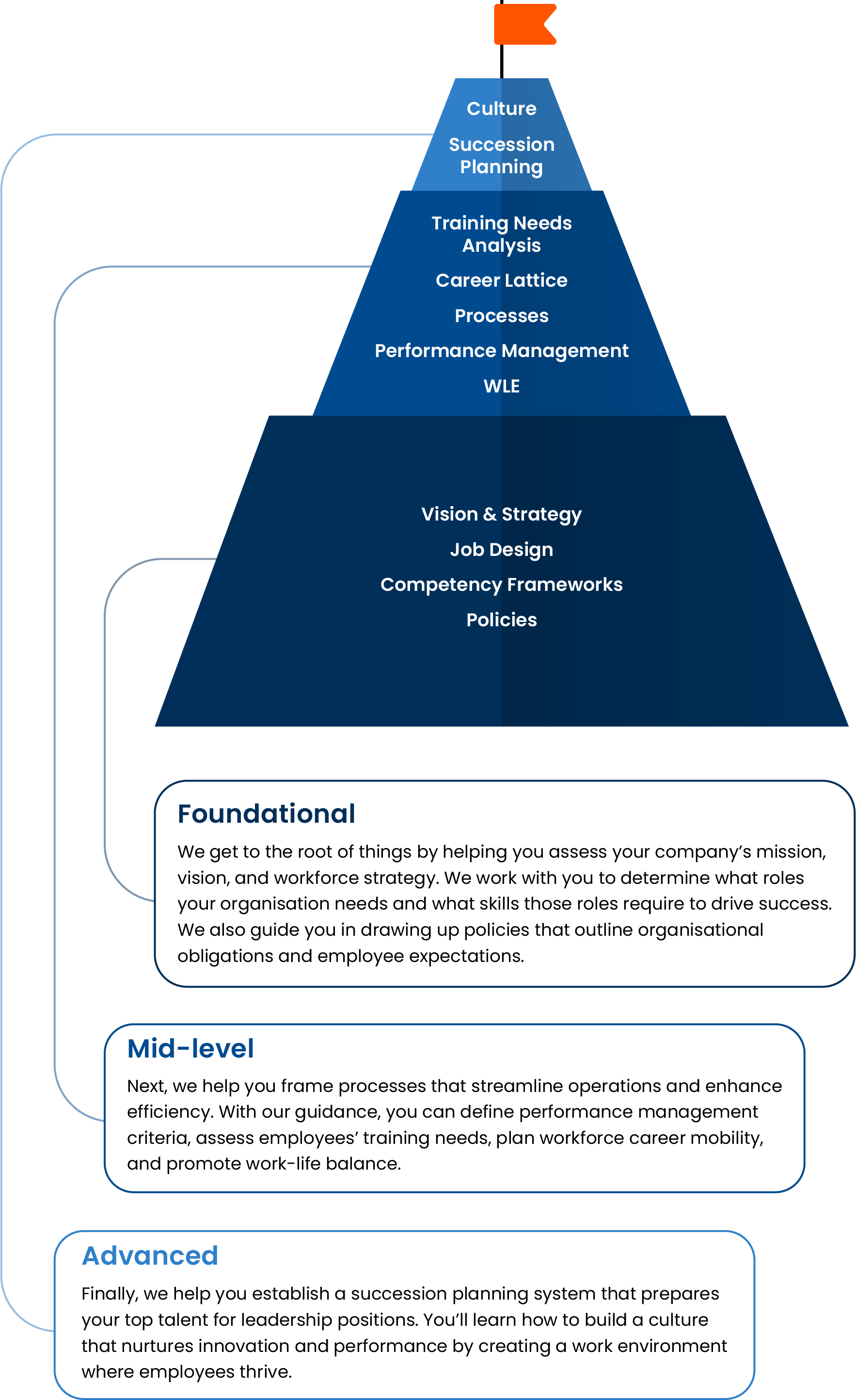 Aligning with organisational goals: Support business goals by identifying critical business areas that require people-focused planning and initiatives for organisational success today and in the long term.
